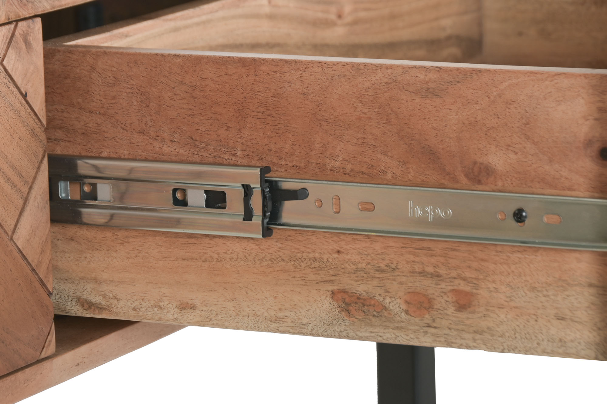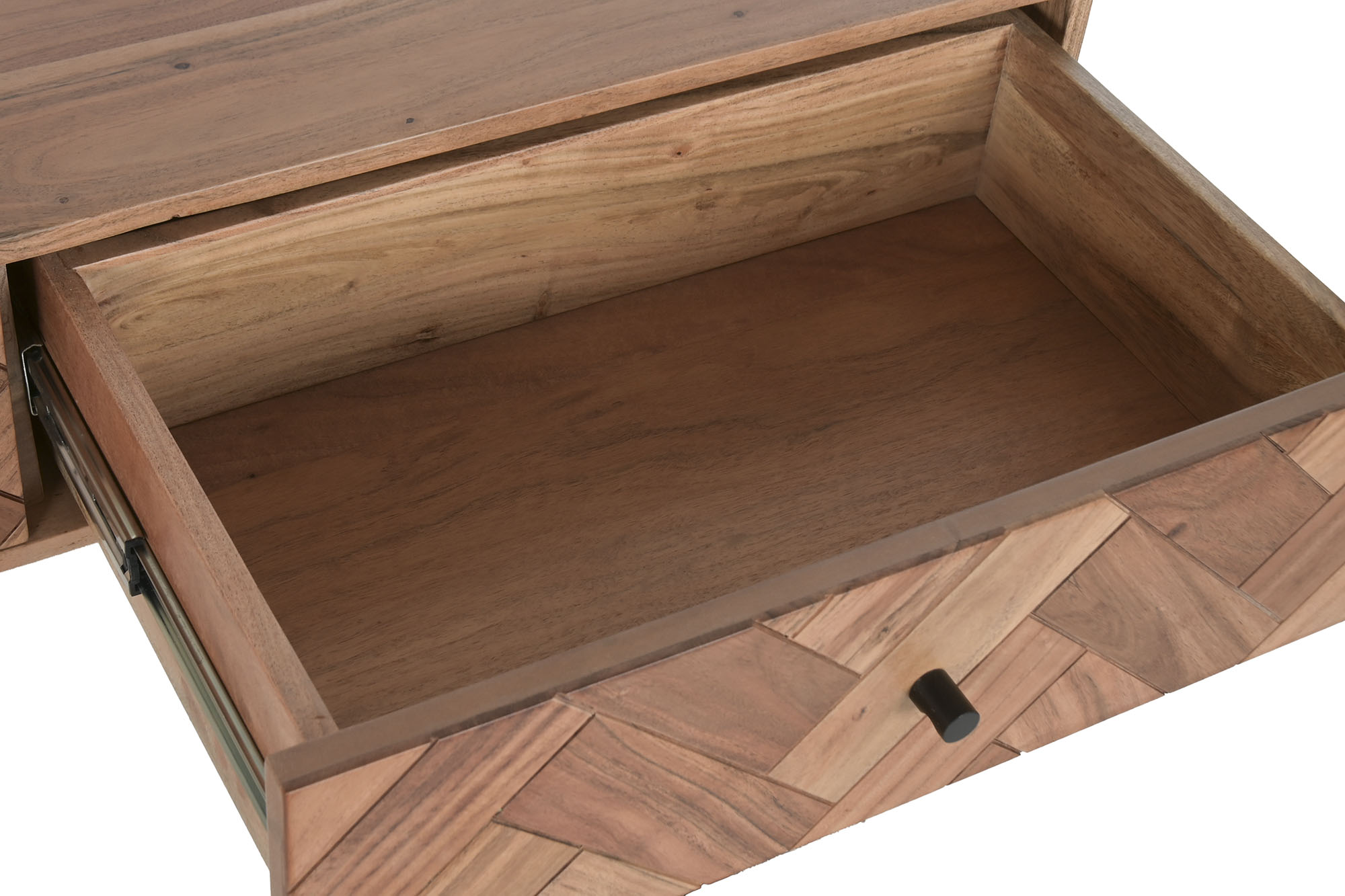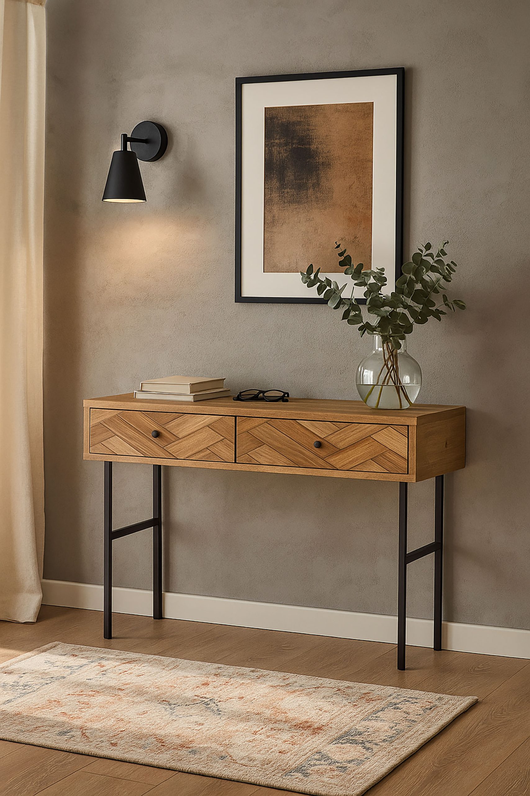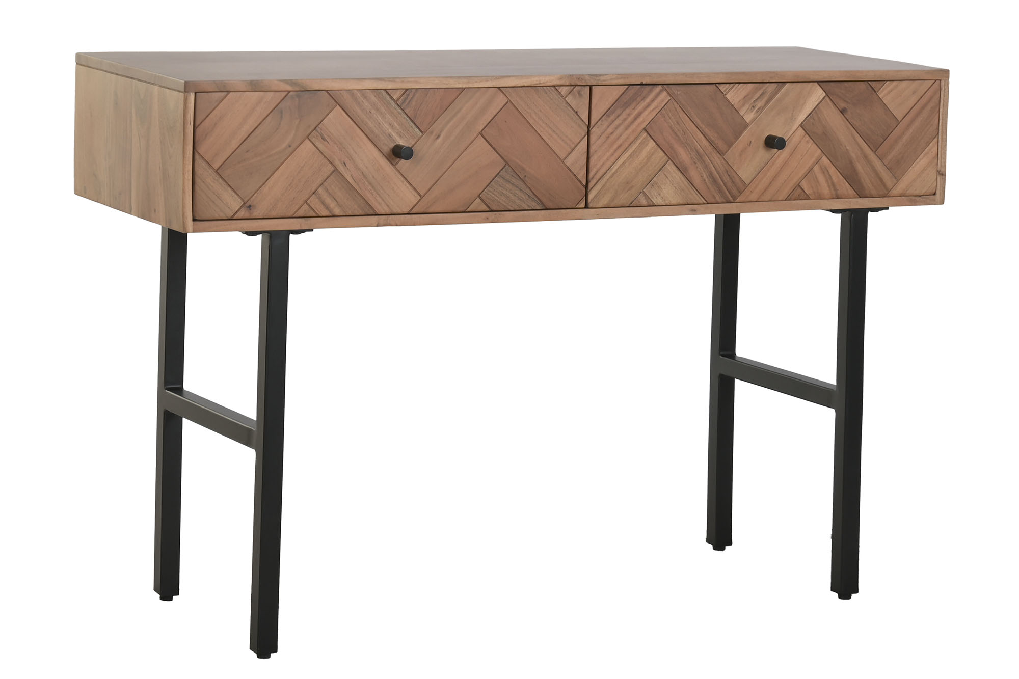 This contemporary console table combines the natural warmth of acacia wood with the clean lines of a black metal frame, creating a balanced and modern design. Featuring two practical drawers, it offers both style and functionality, making it ideal for entrance halls, living areas or behind a sofa.