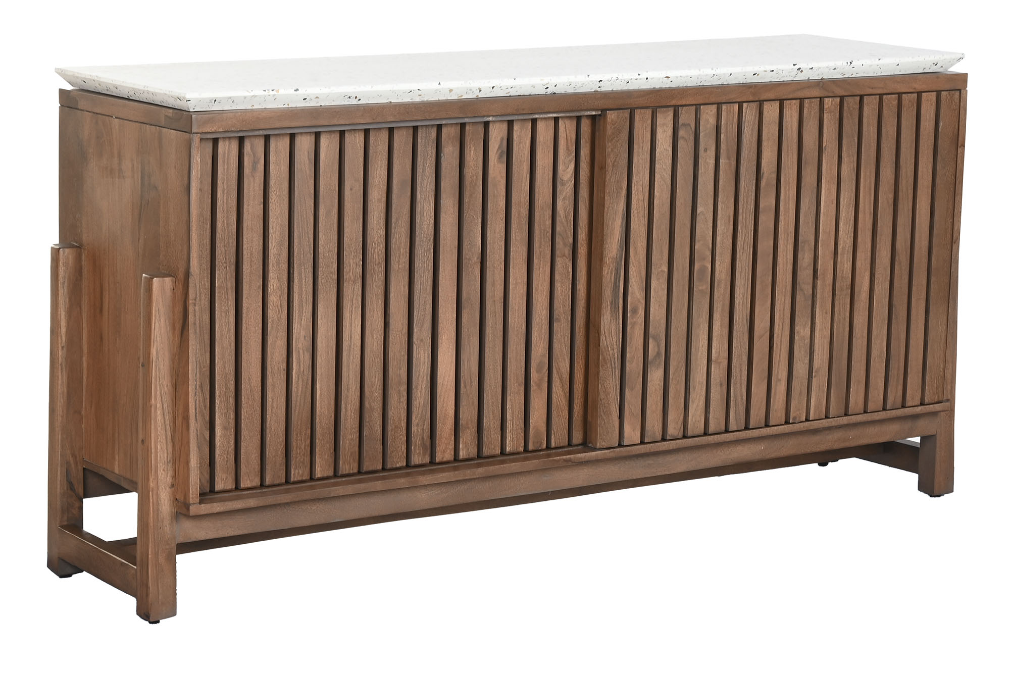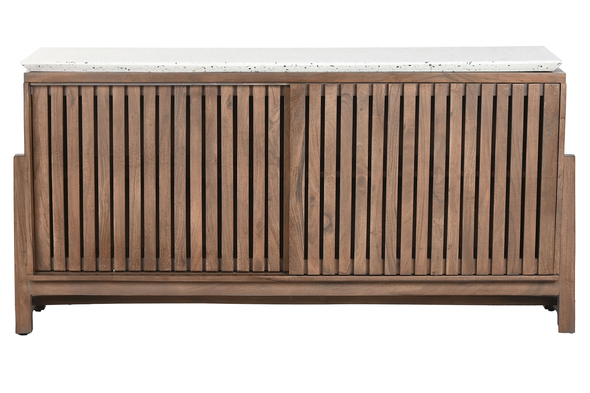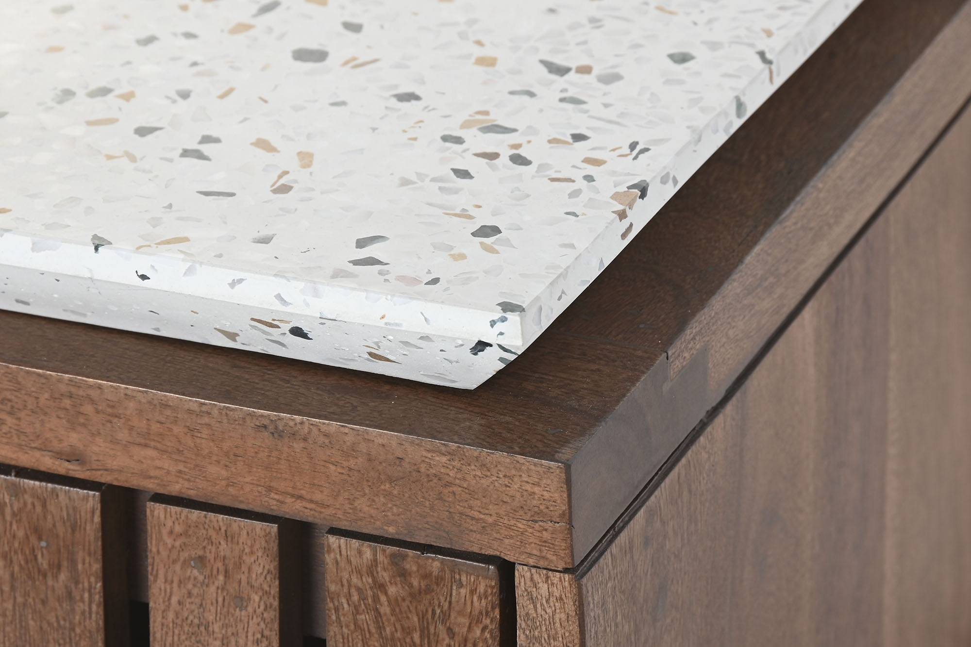 The Acacia & Terrazzo Buffet blends natural craftsmanship with modern sophistication. Its solid acacia wood structure contrasts beautifully with the terrazzo surface, creating a striking centerpiece that suits both modern and oriental-inspired interiors. This piece stands out for its tactile materials and clean geometric design, offering both elegance and durability.