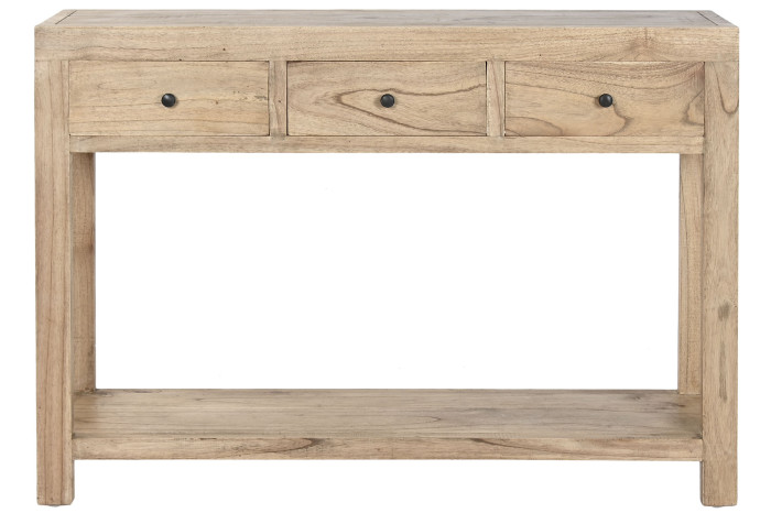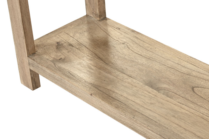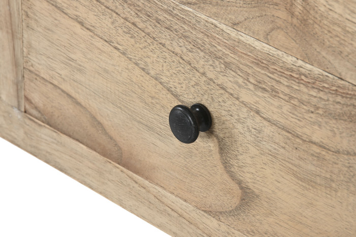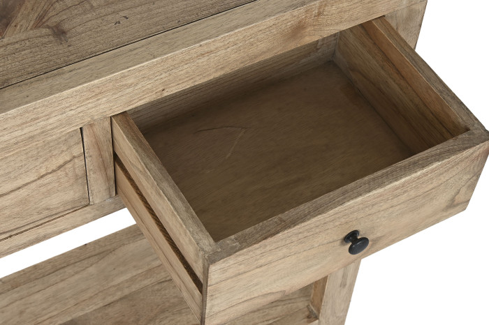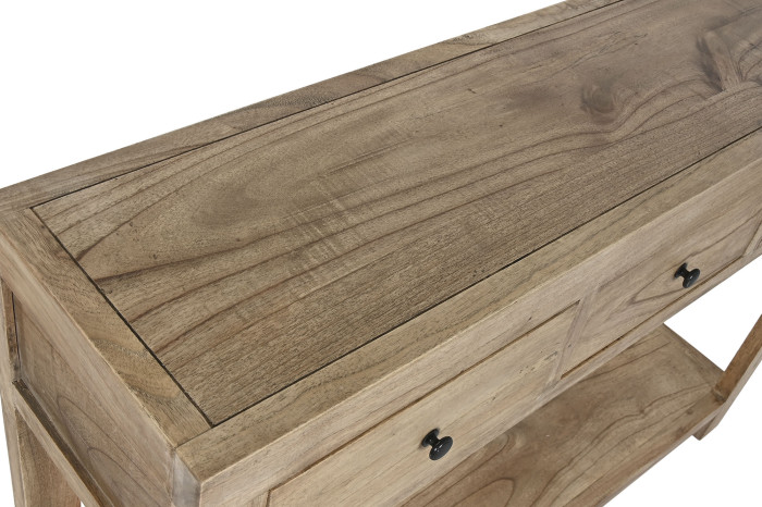 With its slim depth of just 30 cm, it is ideal for narrow areas such as entrances or corridors, offering functionality without overwhelming the space. Crafted entirely from solid Mindi wood, the console showcases natural grain variations that enhance its timeless appeal.