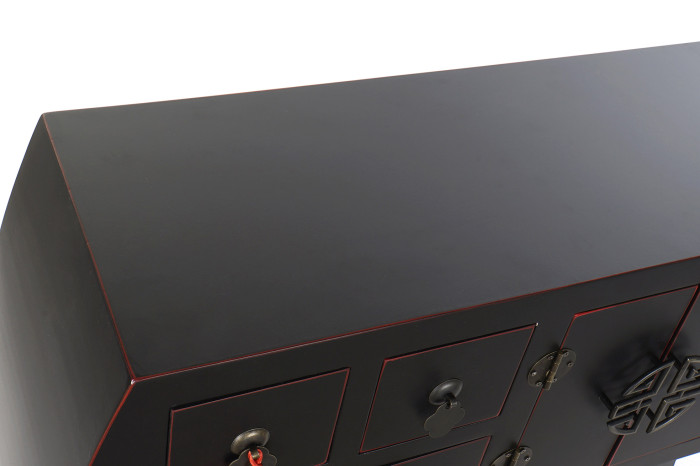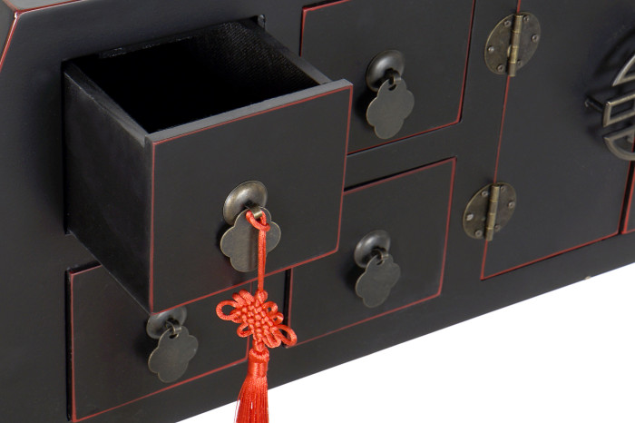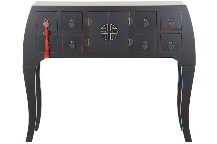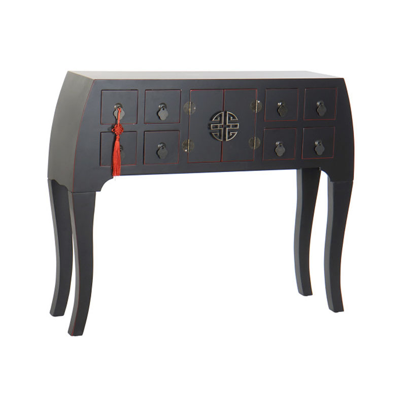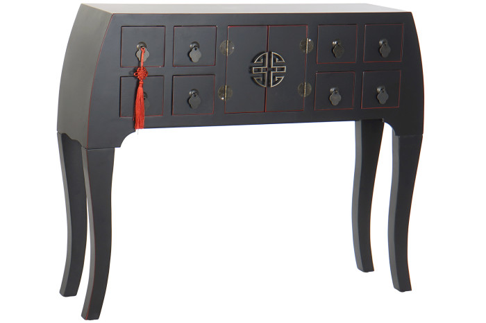 This elegant Oriental-style console table combines timeless design with practical functionality. Crafted from spruce wood and MDF, it features a sophisticated black finish with red accents, highlighting its artistic and exotic appeal. Perfect for hallways, living rooms, or entry spaces, this piece adds warmth and character to any décor.