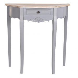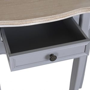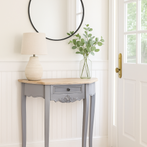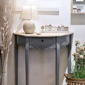 The Tradi Console Table combines classic charm with practical function. Crafted from paulownia wood and MDF, it showcases a natural wood structure accented by a soft grey drawer front, creating a timeless and versatile look. Its compact design makes it ideal for hallways, bedrooms, or living areas, offering a perfect balance between style and utility.