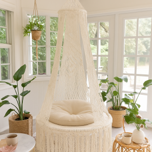 Lightweight and easy to install, this hanging chair blends effortlessly with modern, coastal, or boho interiors, making it an inviting accent for relaxation and style.
