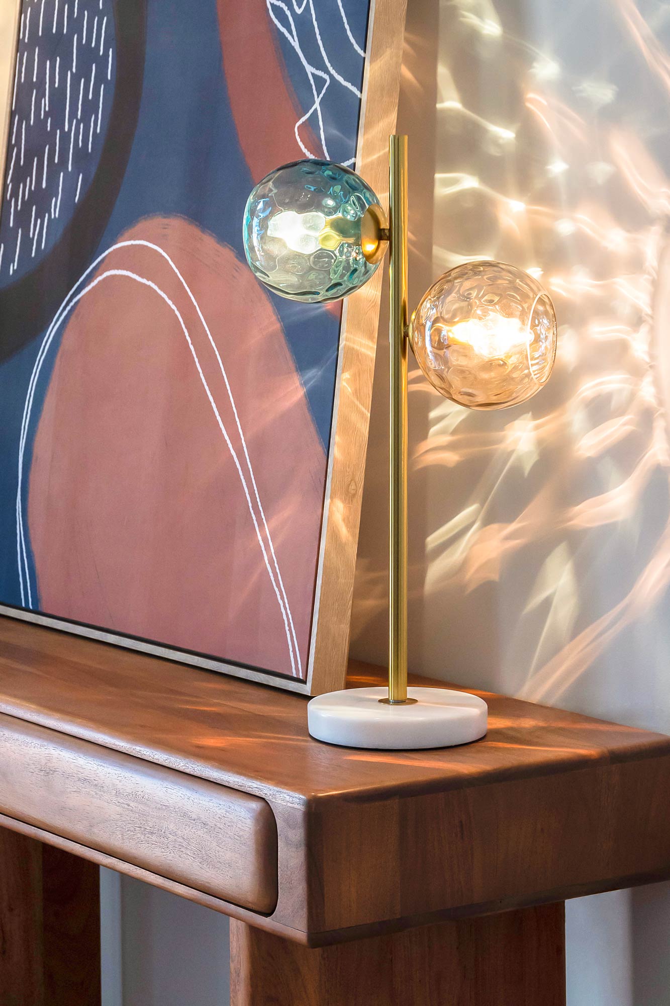 Elevate your space with this striking Golden Balls Table Lamp, a sculptural statement piece from the BOWLA Collection. Crafted from premium marble, glass, and metal, this lamp features two elegant glass spheres that create a luxurious interplay of light and texture. The golden metallic accents enhance its glamour, making it the perfect addition to bedrooms, living rooms, sideboards, or modern workspaces.