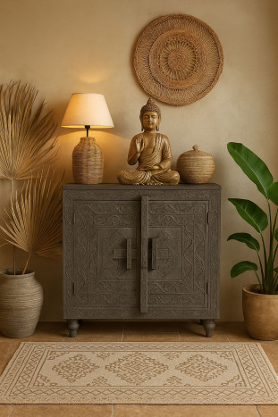 Add character and artisan detail to your home with this beautifully carved wooden sideboard in an elegant grey finish. Inspired by Indian design, this piece blends intricate craftsmanship with practical storage, making it both decorative and functional.