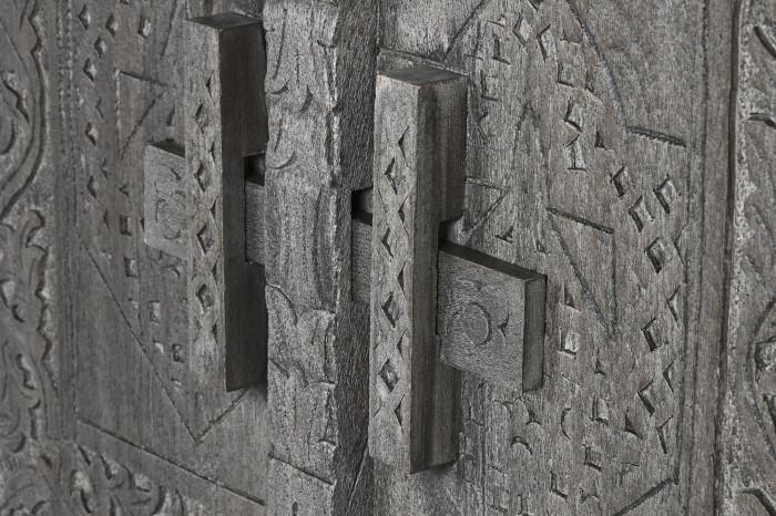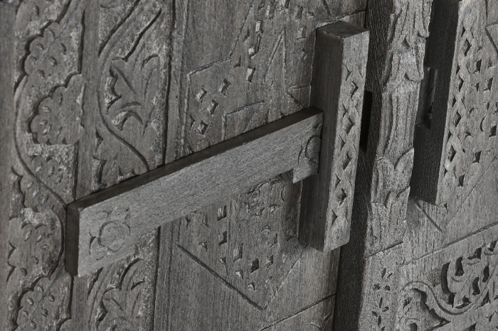 The detailed carved doors create texture and depth, while the soft grey tone makes it easy to style in both modern and eclectic interiors.